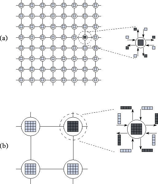 If the number of communication partners per task is small, we can often reduce both the number of communication operations and the total communication volume by increasing the granularity of our partition, that is, by agglomerating several tasks into one. This effect is illustrated in Figure 2.12. In this figure, the reduction in communication costs is due to a surface-to-volume effect . In other words, the communication requirements of a task are proportional to the surface of the subdomain on which it operates, while the computation requirements are proportional to the subdomain's volume. In a two-dimensional problem, the ``surface'' scales with the problem size while the ``volume'' scales as the problem size squared. Hence, the amount of communication performed for a unit of computation (the communication/computation ratio ) decreases as task size increases. This effect is often visible when a partition is obtained by using domain decomposition techniques.